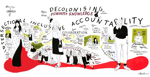 The Decolonising Feminist Knowledge workshop which took place on 22 May 2019 at the University of Edinburgh was an event that I really looked forward to – it formed the culmination of such wonderful work taking place on campus. It emerged from a research and reading group, and a larger North-South research project, Teaching Feminisms, Transforming Lives (TFTL). Being a part of the organising team, our vision was to inculcate an arts-based element to our academically intensive day-long line up. Upon doing some research, we came across Raquel Durán’s work: Raquel, as a London-based artist, specialises in graphic recording and live illustration. From the moment we reached out to her, our association was one based on coming together to find an innovative way to communicate complex ideas – the result was a detailed hand-painted mural capturing the day’s events.