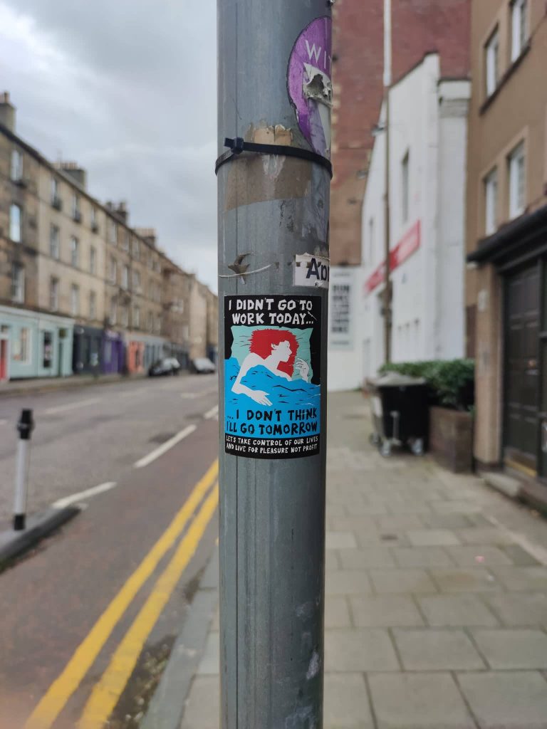 Copy of 1980s anti-capitalist poster “I didn’t Go To Work Today” as spotted on Edinburgh lamppost by the author. Reproduced with permission.