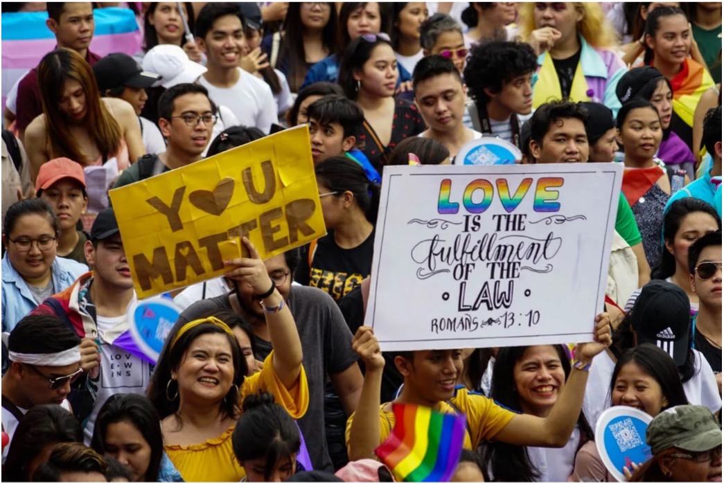 A sign at the annual Metro Manila LGBTQIA+ Pride Parade quotes scripture from Romans 13:10 – ‘Love is the fulfilment of the law’ (Rappler 2018)